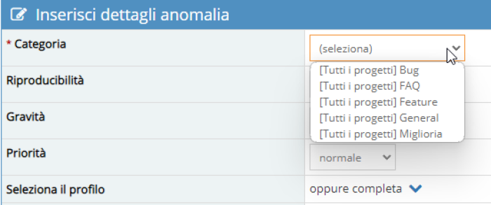 Scegliere se la segnalazione é relativa ad un malfunzionamento (Bug), ad una richiesta di analisi o consulenza (FAQ), un problema legato alle caratteristiche del software (Feature),