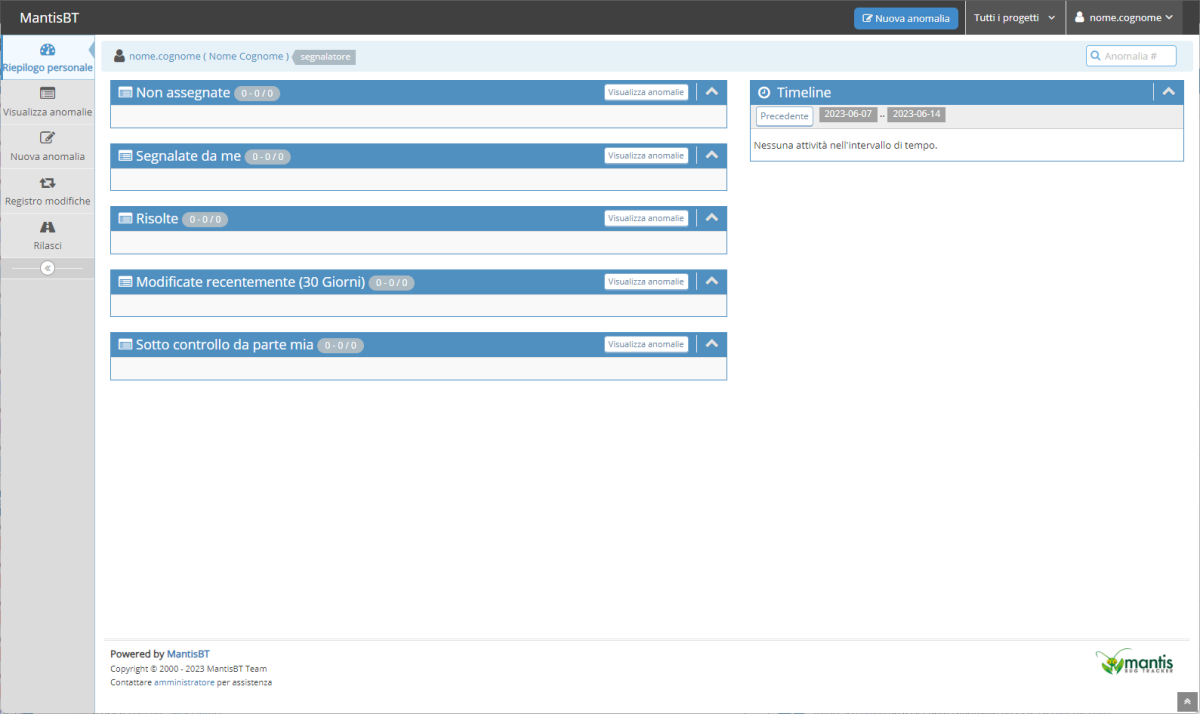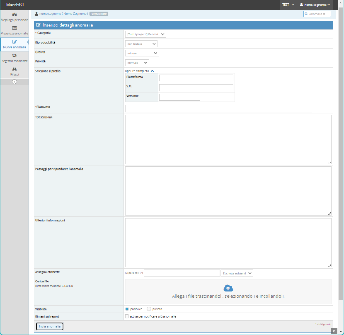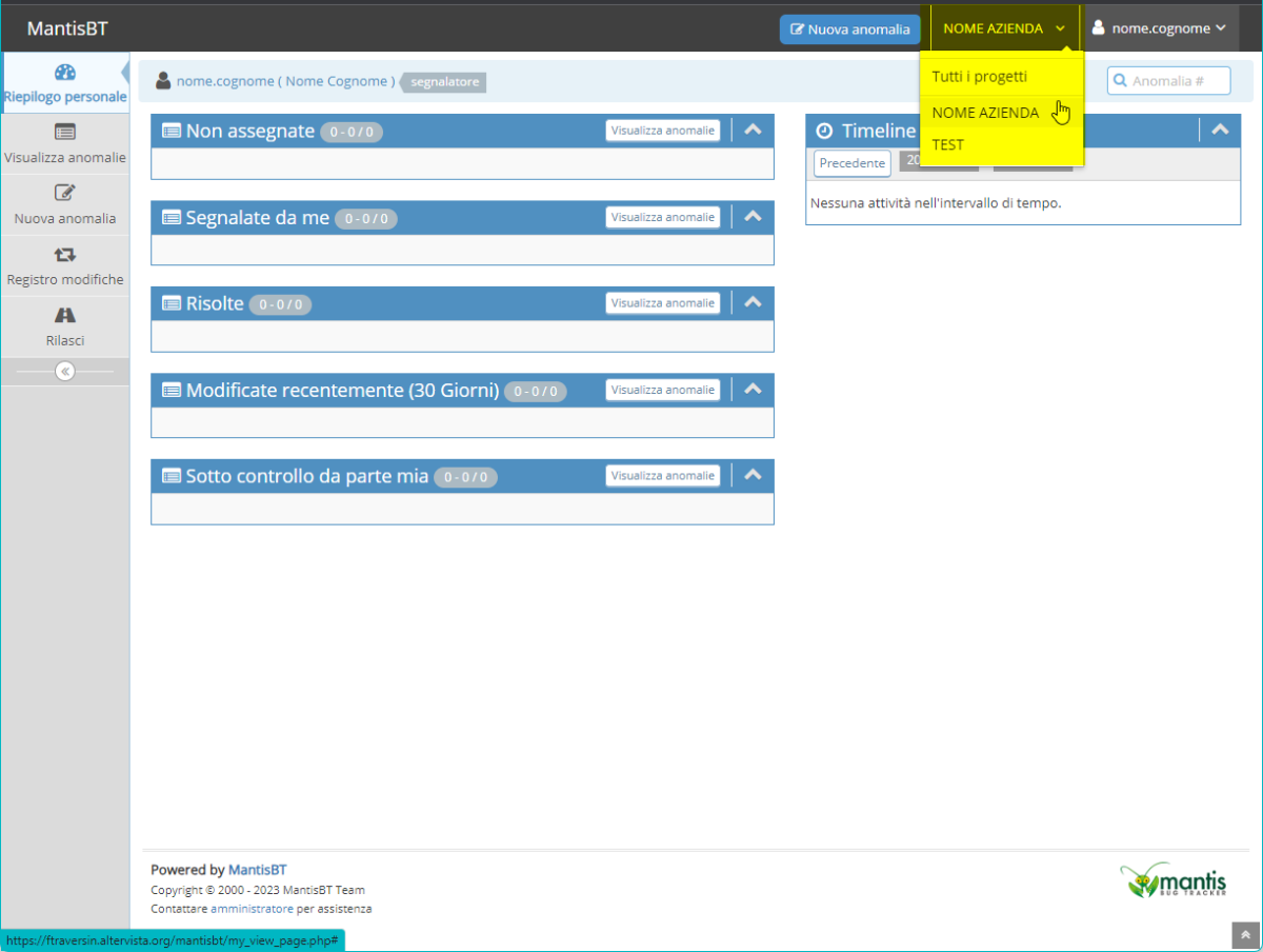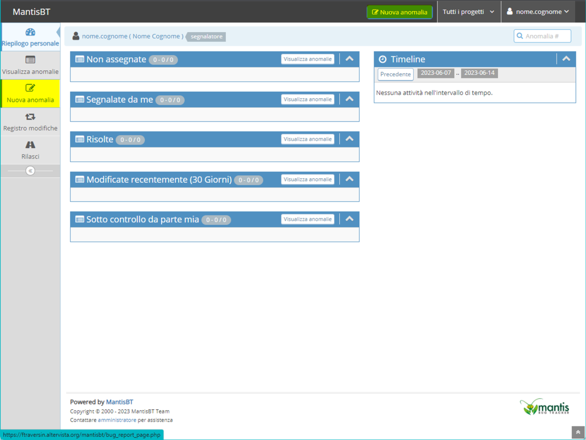 Per creare una nuova anomalia/segnalazione é sufficiente selezionare l'opzione Nuova anomalia in altro a destra, nella toolbar di Mantis, oppure dal menù verticale a scomparsa sulla sinistra.