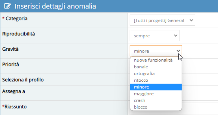 Definisce il fattore di gravità della segnalazione e la ripercussione che ha nell'utilizzo del software.