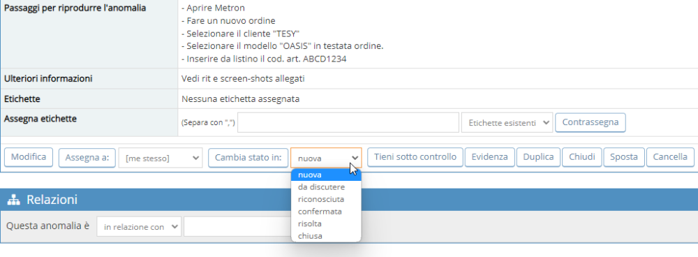 Pertanto, nell'esposizione, ci si dovrà porre nella condizione come quella di spiegare il problema ad un “estraneo”. - Utilizzare e sfruttare le caratteristiche offerte da Mantis, per organizzare al meglio le segnalazioni: ad esempio in caso di anomalie simili, come ad esempio il caso di elementi diversi che presentano la stessa criticità o che dipendono una dall'altra, è possibile “collegare” le due segnalazioni tramite una relazione. Questo permette allo sviluppatore di fare i test necessari e ridurre i tempi di verifica.