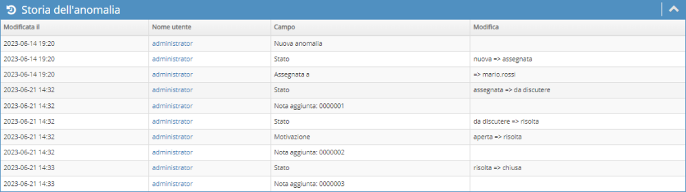 Nel box Storia dell'anomalia viene invece riportata la crono-storia delle attività e dei cambi di stato.