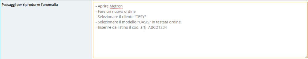 Campo descrittivo per specificare passo passo le operazioni da fare e il flusso da seguire per riprodurre il problema segnalato.