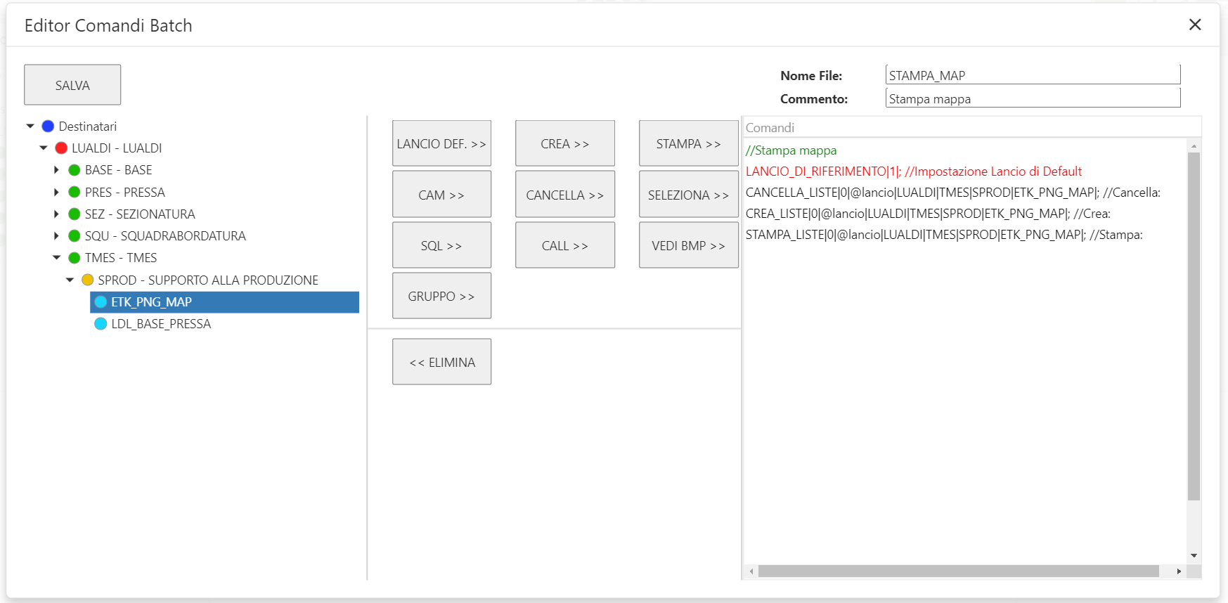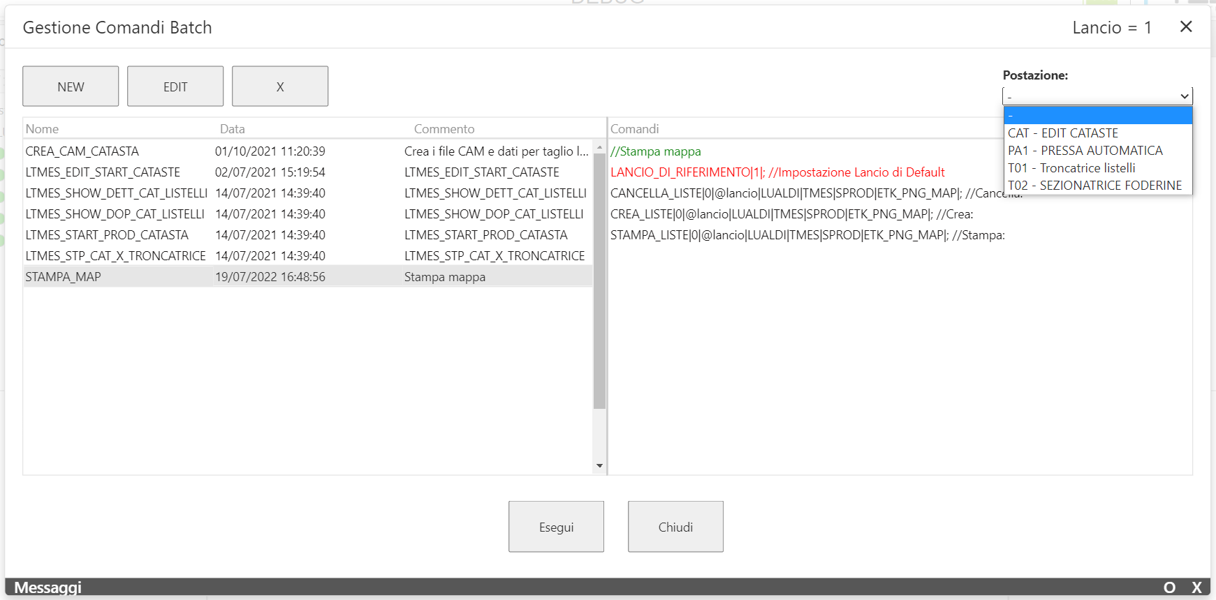 Tramite il pulsante Esegui in basso è possibile eseguire il comando batch selezionato, usando la postazione specificata nel menu in alto a destra.