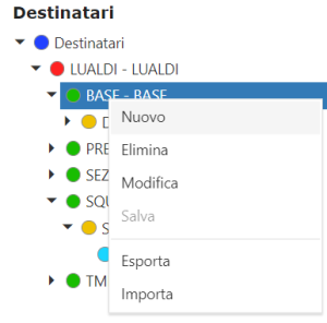 Nella lista destinatari è possibile, premendo il tasto destro del mouse su un elemento o tramite i pulsanti in alto, effettuare le seguenti azioni: