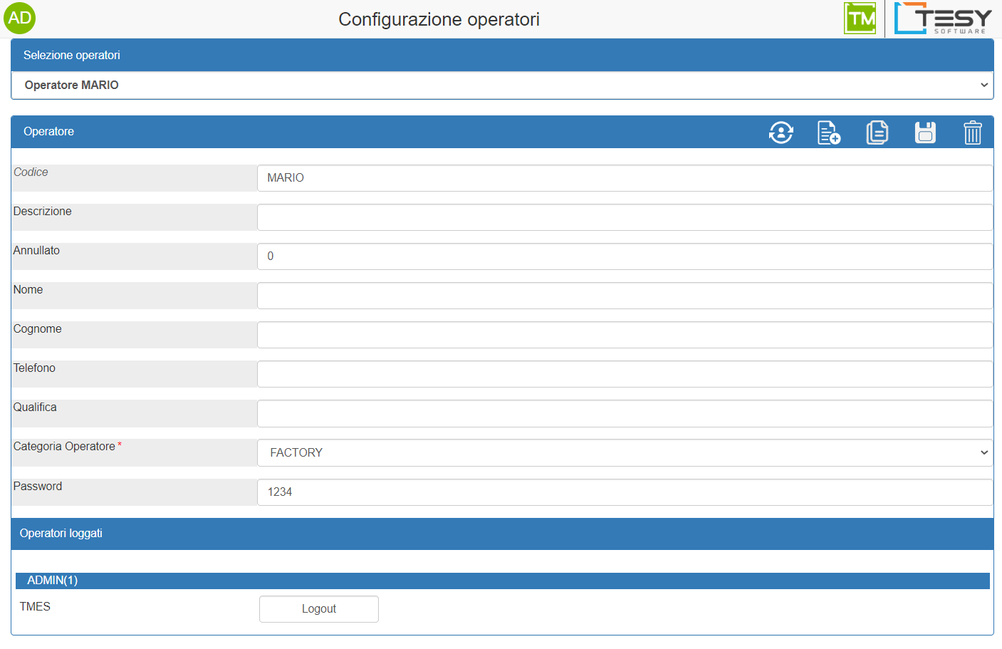La Configurazione Operatori è lo strumento TMes attraverso il quale si possono gestire i dati riguardanti gli operatori del sistema.