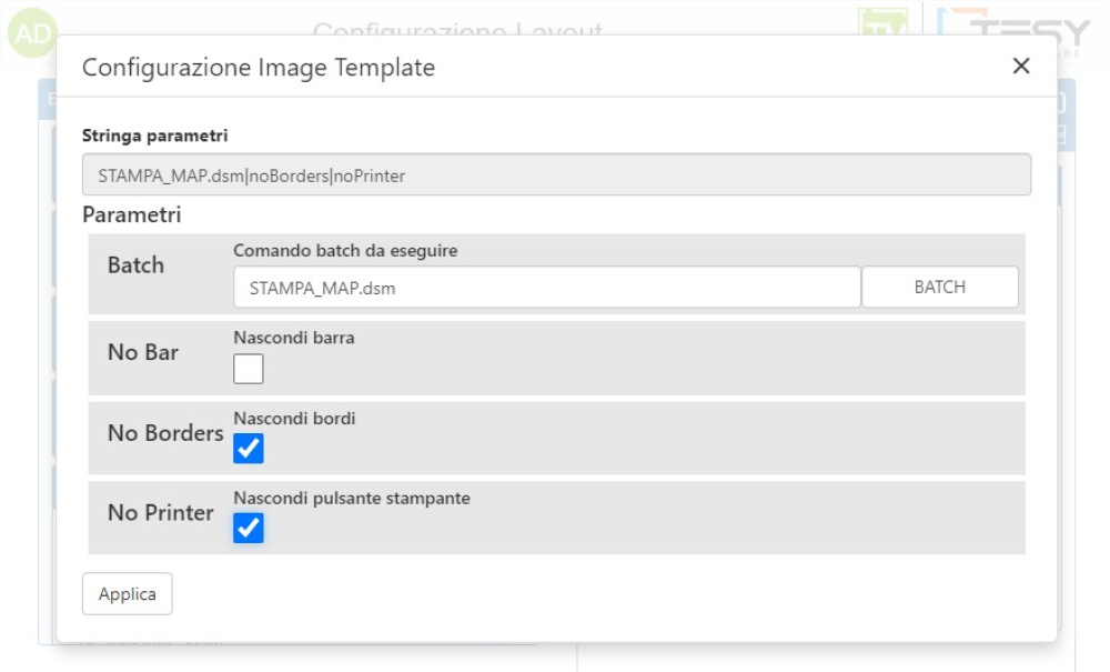 Il template può essere configurato tramite il popup di configurazione in Configurazione Layout dopo aver specificato Url Layout == imageTemplate.