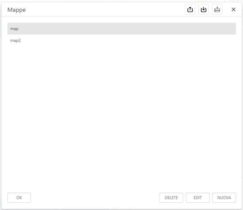 Tramite i pulsanti in alto a destra è possibile importare od esportare le mappe, le mappe esportate sono salvate come file .json nella cartella chiamata “mappe” nella directory di export (deve essere creata manualmente se non presente).