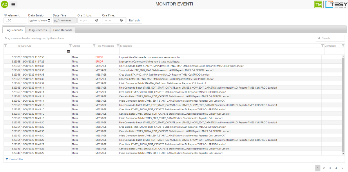 Di default vengono visualizzati gli ultimi 100 elementi, è possibile raffinare la ricerca specificando: