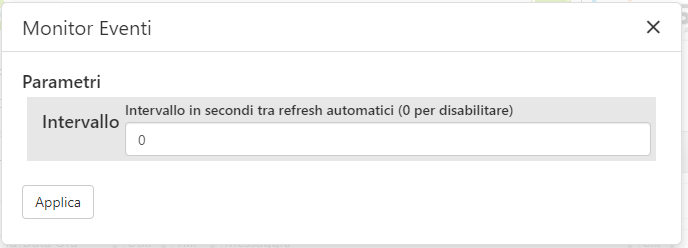 Nel Monitor Eventi è possibile impostare l'intervallo (in secondi) per l'aggiornamento automatico della pagina.